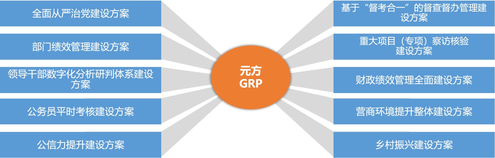 元方以新公共管理理論為支撐,以互聯網信息化技術為工具,為國家治理體系和治理能力現代化建設提供了數字化管理、信息平臺建設和服務。創建了以政策研究為引領,集咨詢服務、考核評估、察訪核驗、數據分析、教育培訓、宣傳推廣為一體的公共管理改革輔助支持體系,為各級黨委政府執政能力建設提供全面解決方案。