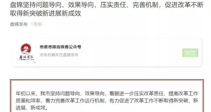 2018年11月14日,盤錦市委市政府政務公眾號“盤錦發布”在《盤錦堅持問題導向、效果導向,壓實責任、完善機制,促進改革不斷取得新突破新進展新成效》一文中對重點改革項目評估也作出充分肯定: “通過開展第三方評估,進一步找準了重點改革推進中存在的突出問題,明晰了下一步改革工作的努力方向和具體措施,有力推動了相關問題的有效解決和改革舉措的落地落實。”
